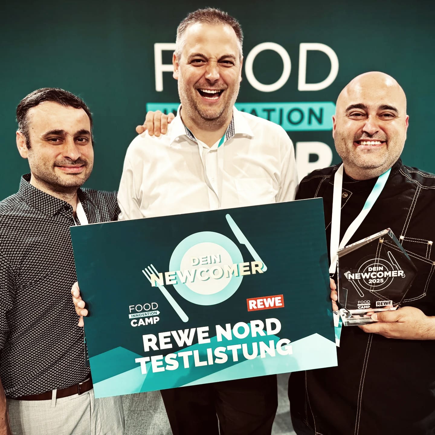 Im Rahmen des Food Innovation Camps haben wir am 23. Juni gemeinsam mit unserem Partner der REWE Nord das dritte Mal den Publikumspreis Dein Newcomer 2025 vergeben. Vorher pitchte die Top 8 beim REWE Pitch Day vor den Einkäufer:innen der REWE. Für die dort gekürte Top 3 bestehend aus Djoon, O-SOME TASTE und Oh my Seed ging es dann weiter im Finale auf dem Food Innovation Camp, wo sie in einem weiteren live Pitch für den Titel Dein Newcomer 2025 und eine Probelistung bei der REWE Nord antraten. Den Titel sicherte sich in diesem Jahr O-SOME TASTE, die mit hoher Qualität, gutem Geschmack und einem auffälligen Verpackungsdesign überzeugen konnten.