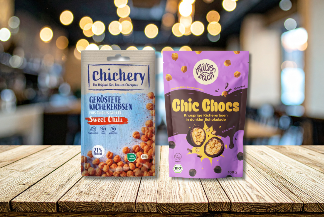 Hülsenreich entwickelt gesunde, vegane Snacks auf Basis von Bio-Kichererbsen. Das Sortiment umfasst knusprig geröstete Varianten wie Sweet Onion, Curry oder Tomate-Basilikum sowie mit Fairtrade-Schokolade ummantelte Produkte. Alle Snacks sind bio, vegan, glutenfrei sowie reich an Protein und Ballaststoffen. Der Fokus liegt auf funktionaler, pflanzenbasierter Ernährung bei ausgewogenem Geschmack. Beide Startups setzen auf Kichererbsen als gesunde Snackgrundlage. Chichery legt den Schwerpunkt auf fettfreie Röstung und Crunch, während Hülsenreich zusätzlich Bio-, Vegan- und Funktionalitätsaspekte in den Vordergrund stellt.