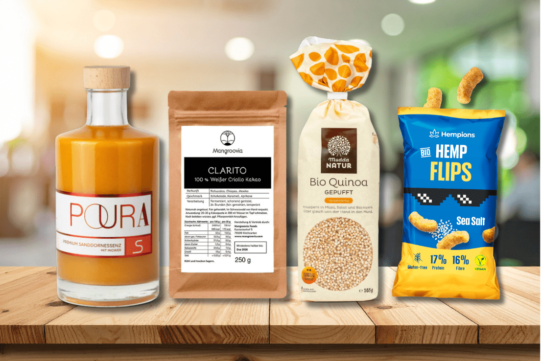 In der Food.Startup-Szene entstehen zunehmend Superfood-Produkte, die gesunde Ernährung, Nachhaltigkeit und auch Alltagstauglichkeit verbinden. POURA bietet alkoholfreie Premium-Drinks aus biozertifizierten Essenzen wie Ingwer, Kurkuma und Sanddorn, ergänzt durch Superfoods wie Goji-Beere, Zitrone und Maca. Mangroovia spezialisiert sich auf naturbelassenen Kakao und Superfoods in Bio-Qualität, direkt von Kleinbauern in Mexiko, Peru und Bolivien, unter Beachtung nachhaltiger Anbau- und Permakulturprinzipien. Mudda Natur produziert vegane und glutenfreie Quinoa-Produkte aus heimischer Wertschöpfungskette in Wölfersheim, ohne Zusatzstoffe. Hempions stellt Hanfsamen-basierte Produkte her, darunter Snacks, Proteinpulver und Öle, die Nährstoffe wie Protein, Omega-3-Fettsäuren sowie Vitamine und Mineralstoffe liefern.